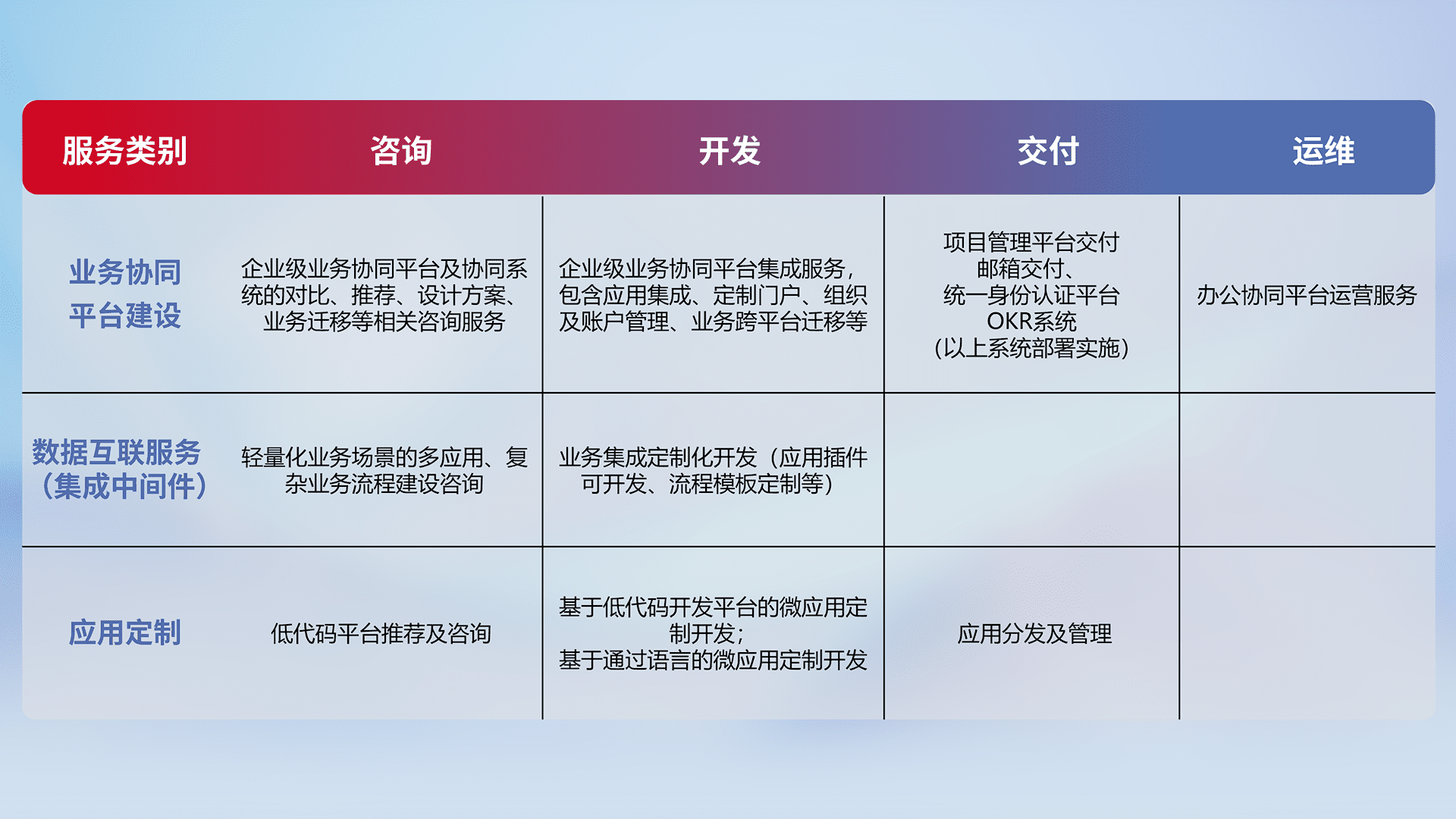 针对钉钉、、企微、、、IDaas等平台级产品提供产品的规划、、、、方案、、、、交付、、、、定制化开发等服务,,实现如统一协同办公、、、、智能客户服务、、混合会议管理、、、、智能数据查询、、、等业务场景,,,,实现数字化转型。。。。