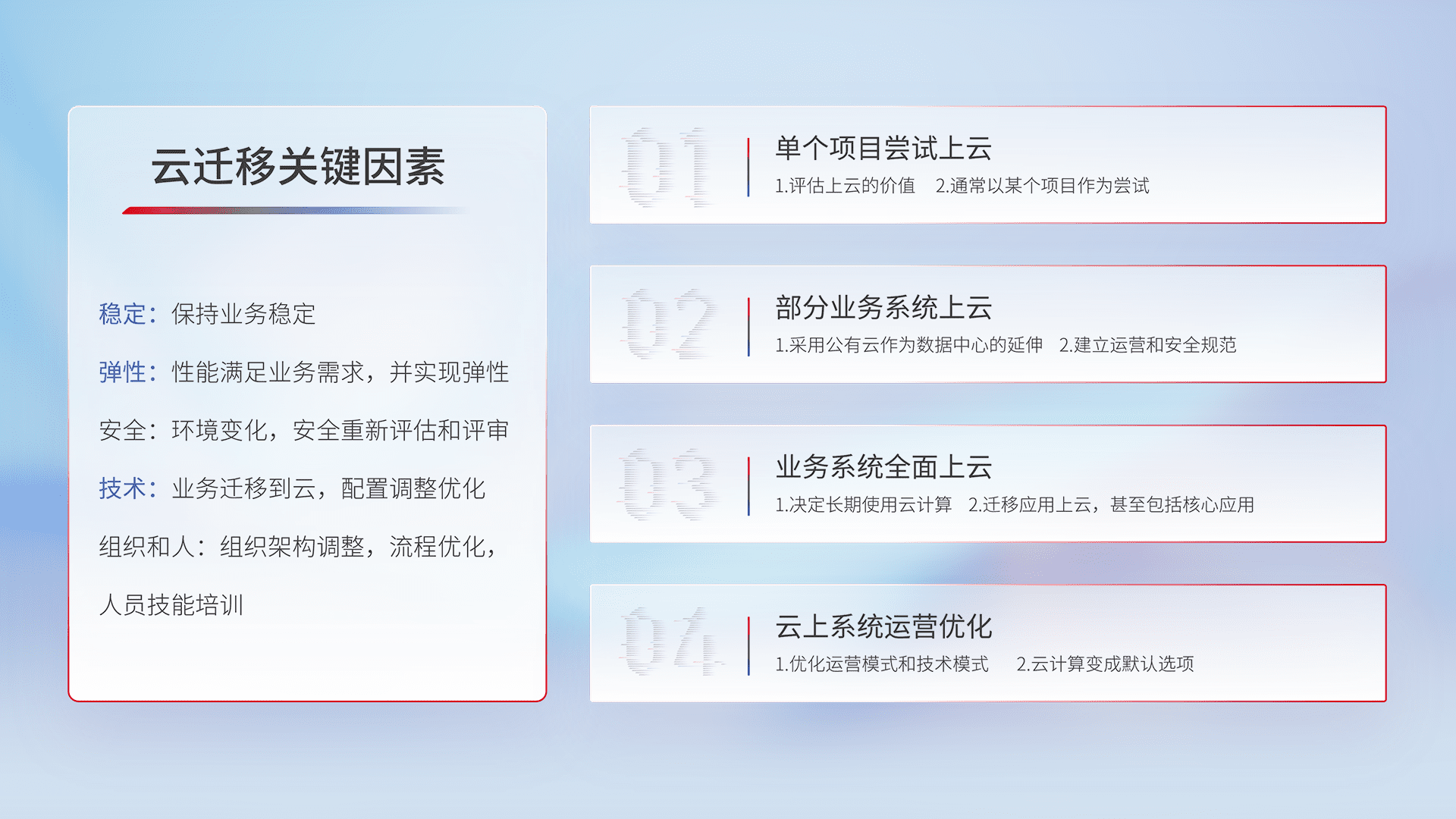 结合实际业务,,,,从规划设计、、云平台选型、、、、云原生改造、、、数据迁移、、、、集成交付,,,,迁移全过程为客户识别最佳上云路径,,,做好风险识别管理,,设计网络架构、、、、身份权限、、、安全审计合规、、操作审计、、、、日志审计、、监控告警策略、、、、多站点容灾设计等,,,对云上基础设施进行整体规划,,,提升IT治理水平,,以满足弹性、、、高可用、、、、高性能的需求。。。。