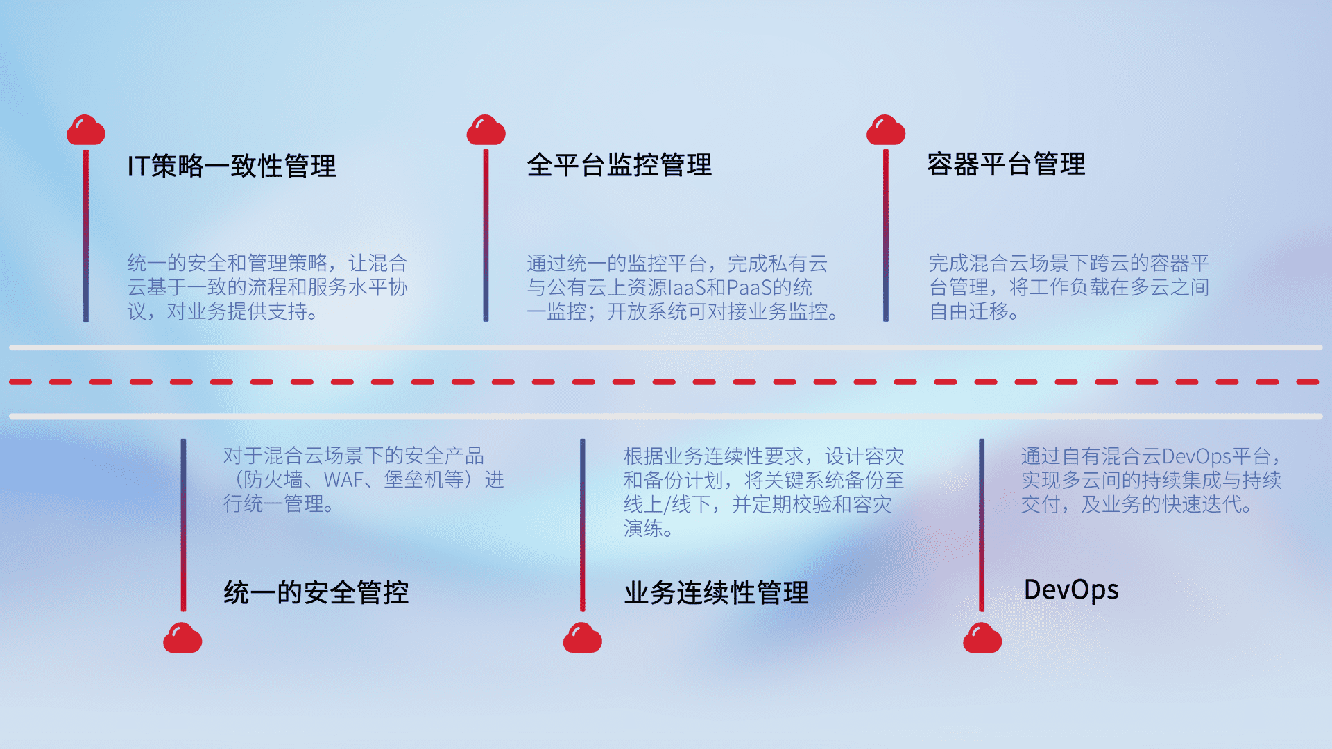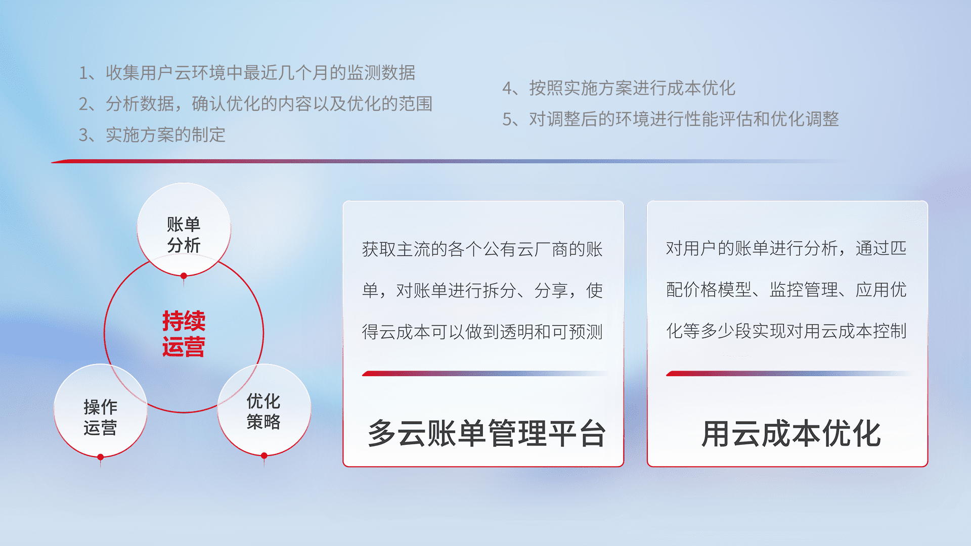 通过多云纳管,,,以统一的资源数据模型把客户的云资源进行抽象和封装,,,,进而实现对多云资源的统一操作,,保障云资源管理的可靠性、、稳定性与可用性。。量身定制化运维内容,,配置、、、、开发运维、、补丁管理、、备份、、监控、、认证和访问管理、、、审计和日常巡检等,,,,保障在用云过程中的可靠度,,,稳定度以及高可用率。。。