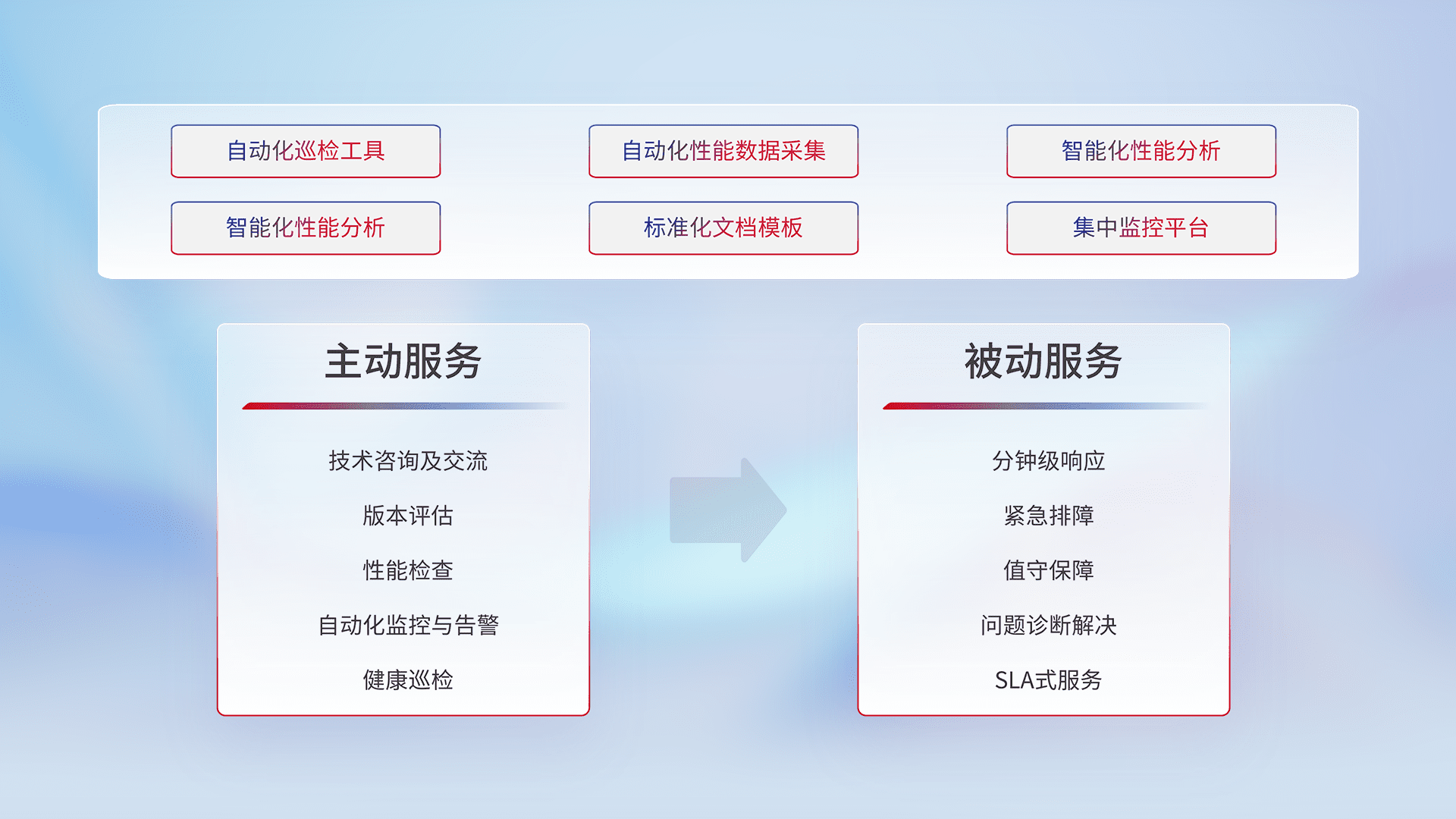 智能化工具和标准化文档,,,保障服务质量,,提供主动服务(包含技术咨询、、版本评估、、、性能检查、、自动化监控与告警、、、健康巡检)和被动服务包含(分钟级响应、、、紧急排障、、值守保障、、问题诊断解决、、、、SLA服务)。。。。